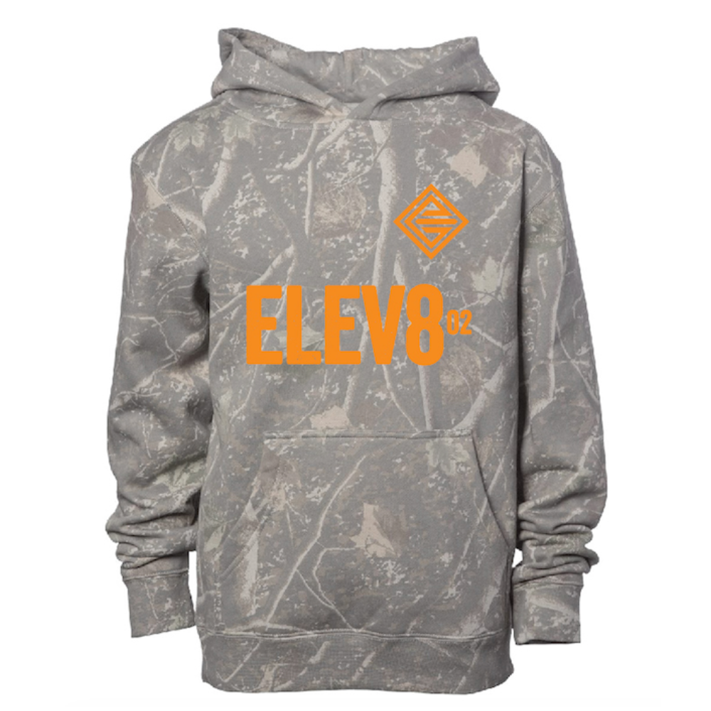 The Gray Camo SwaggyP Hoodie brings rugged style with bold orange branding that pops. Built for comfort on and off the ice, it features a soft midweight cotton blend, classic camo design, and our signature ELEV8 logos front and back.